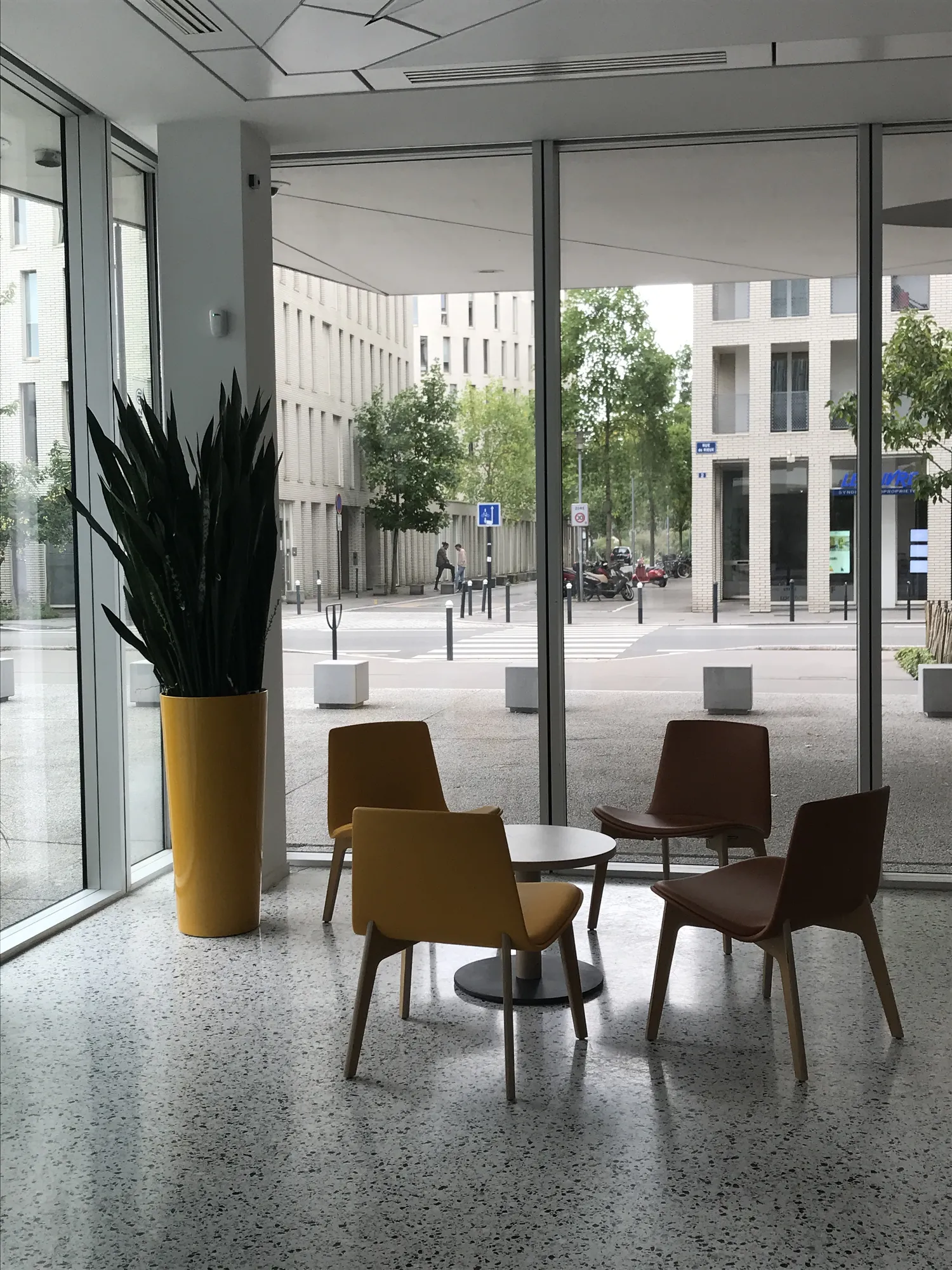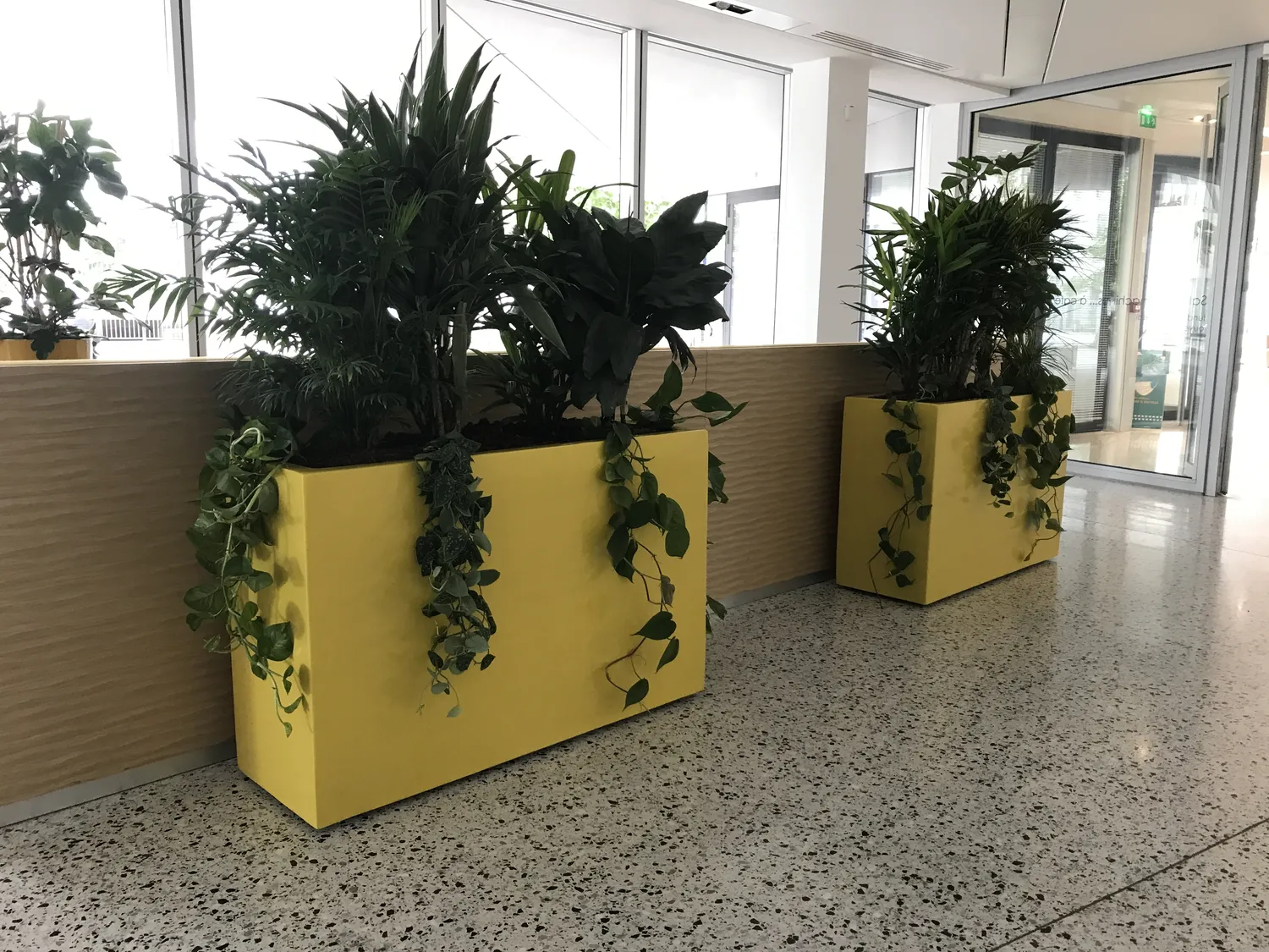 Pour répondre à ces attentes, nous avons proposé l’installation de jardinières hautes de 75 cm, pensées pour s’aligner parfaitement avec le dos des banquettes. Le choix de jardinières rectangulaires de 120 cm de long permettait de créer une séparation linéaire et harmonieuse, renforçant l’effet de cloison végétale. Afin d’apporter une touche lumineuse et dynamique, les jardinières ont été sélectionnées dans des coloris évoquant le soleil, pour contraster avec les teintes souvent neutres d’un espace de restauration.